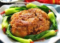 蒸制这种肉的腌菜是修水人自制的芥菜干,修水人称为腌(盐)菜干。取上等带皮五花肉放沸水中煮至五成熟,捞起后擦去皮上油水,趁热抹上酱油,切成6~7厘米长,1厘米厚的片,注意皮不要切断。将水发芥菜干铺碗底,切几个小尖椒,大蒜头铺上,再撒上姜未、胡椒粉,加料酒、精盐等佐料,再将肉皮朝下压在干菜上,用碗扣住上笼蒸熟。取出时翻扣至盘内即可。特点是色赫味香肉熟烂,食之不腻,干菜咀嚼有味。