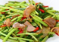 3、锅入下油,将腊肉丝煸香,下藜蒿煸炒调味,入韭菜、红椒丝,炒制即成。