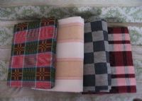 在众多的织锦品种里,黑镶边织锦是极有特点的一种。群众以此作为褥子的专用面料。在整幅面料中,纯黑的平纹占据三份之一左右,另外部分多织成红黄绿白色彩鲜艳的长流水图案。黑镶边长流水图案是自明清以来极为流行的传统锦纹,反映了人们期盼幸福生活细水长流的愿望。“手表、风扇、面棋块”是七十年代出现的纹样,反映了工业生产带来新生活的喜悦心情,手法朴实率直,形象生动。