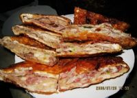 制作时,将面粉用八成热水反复搋成软面,盖上温布稍饧。带骨猪肉剔骨洗净、剁碎,加盐、水(分次加入),调搅上劲,再撒上葱、姜末和花椒面(用时现掺)调成馅,将饧好的面搓成长条,下成剂子,再搓成长圆条,用擀面杖压成长条。摊上馅心,用手扯成长带状,一头没有馅,从摊馅的一头叠起,把两头捏紧,用没带馅的一头盖严,压成椭圆形的饼。然后,平底锅里加入油,烧至五成热,放入生坯,用小火煎制,两面呈金黄色即成。煎制时,油随耗随添。