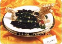 1、将豆腐切成长5cm,宽3cm的块(共24块)用香葱叶包好,入锅中加精盐,味精,高汤,胡椒粉小火烧透入味勾芡,淋葱油摆入盘内,刺参汆水入味;2、勺内加油,放入葱段小火炒出香味,放海参加调料烧透入味;3、将海参摆于豆腐两侧,并用刻好的龙头、龙尾加以点缀成菜。