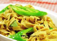 4.再下入干豆腐条,待烧透时下入尖辣椒片、味精翻炒。