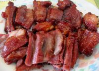 4、从炉口封闭时算起,过45分钟烤肉既熟,掀开大锅,抬出烤肉挂起,用刀刮去猪皮上焦糊的外层,而后取肉切成薄片即可食用。