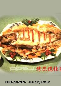 主料:鲜鲑鱼1条1000克辅料:鸡脯肉200克、肥膘100克、火腿肉150克、鸡蛋清50克佐料:料酒60克、白油200克、清汤500克、细盐8克、葱段10克、姜片6克、蒜片60克、花椒4克(布包好)白面260克烹饪工艺:(1)将鲑鱼去鳞冲洗干净,在腹部和尾端切斜口,去净鱼鳃、鱼口去除内脏,冲洗干净,切去下颌骨,在去腹鳍,脊鳍,热水烫过,在刮一次鱼鳞,两边打斜刀象眼块。(2)将鸡脯内去掉白筋,与肥肉膘一起切碎,砸成细泥,加蛋清、料酒、细盐、清汤调成稠糊状。(3)将火腿切成长条片,与鸡料子一起,填入刀口内,用花包好,将白面和好。擀成棉皮,撒上葱、姜末和花椒面,在放上,四周包好捏紧,将烤炉预热至80摄氏度,放入以面包好的鲑鱼,急火烘烤约半小时,至包面烤裂为好,取出打开面,慢慢取出鲑鱼。(4)取面粉150克和好分成两份,用西红柿和蛋黄分别和好,分为红、黄两色擀成筷粗的条,置于模具内压成花篮形,放入油锅炸熟至金黄色取出,制成长方形花篮,把鱼托入花篮内,姜末香醋一起上桌。 风味特点:此菜形如花篮,工艺精巧别致,鱼味鲜美、肉嫩鲜香,是孔府宴中吉祥之菜,有”富贵有余“之寓意。( 东营)