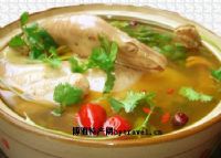 3、坐砂锅点火倒入高汤、香菇片、酸萝卜片、火腿片煮5个小时后,捞出锅里的辅料,放入鸭子,加入少许盐、白胡椒粉、鸡精、料酒,再煲6—8个小时。食用前淋入香菜末即可!