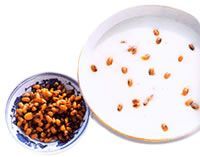 制法:黄豆和小米用水泡开,分别磨成豆浆和米浆,各自过滤出渣;锅加水烧开,下豆浆烧开后,再下米浆,开锅盛入粥碗内。另取少量黄豆放锅中炒熟后加水和盐煮至皮起皱,撒在碗中粥面上即成。
