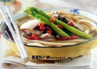 2 将面捞起放入汤底,再加入羊肉、枸杞煮熟,最后放入芦笋煮熟即可食用。