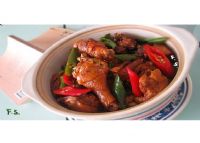 制法:鸡宰杀洗净,改成劈柴块;葱切段、姜切片、青椒切片;勺放油煸姜片、葱段下鸡块炒至灰白色无水分时放酱油再炒至鸡块酱红色加入高汤、盐、药料等温火炖20分钟,待汤汁浓稠时下青椒、味精装盆即成。