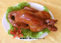 (1)将鸡洗净,剁去鸡小腿,把姜片、葱丝、八角茴香、精盐均匀地撒在鸡身上腌3小时后,用洁布搌干,再把鸡的两条大腿骨砸断,在鸡肚下割长2厘米的小口,把鸡的两条大腿叉起来插入腹内,同时把约13厘米长高粱秸顺着-处插入,撑在鸡胸脯下的软骨上,然后在鸡身上均匀地抹上一薄层饴糖。