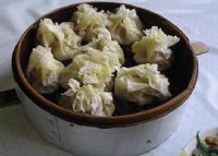 五、选上等细面粉,用温水搅拌反复轧揉,作剂,旋成饺子皮状,边薄有折纹。一两面制成五个,每个重二三钱,包时将酿成的馅装在面皮内,撮成上如石榴花形,下如灯笼形的'烧麦',上笼蒸20分钟即成。