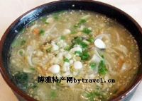 做法:锅中放清水或者高汤,先下少许玉米面,小火煮20分钟,再放入干豆角、胡萝卜丝、面条、青菜、盐、味精,面条煮熟后撒熟芝麻仁、杏仁、葱花,淋香油。