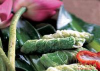 (3)将白菜叶放入略加盐的沸水中,略烫一下捞出,沥干水分,切掉叶茎,在每片菜叶上放入搅拌均匀的馅料,放好后卷包,两头用细线扎住。