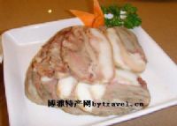 往瓦钵内倒入卤水,加上清水1500克,用中火烧沸后,放入捆蹄,改用微火煮一小时后取出,再用钢针在猪脚皮上下戳进小孔,放进瓦钵里,再用微火煮一小时,取出凉冷后,解去绳子、竹板和纱布,用芝麻油涂抹猪脚皮面。食用时将缝线抽出,然后放于砧板上,先切成两半,再分别切成半月形薄片,叠放于盘中。上菜时根据宾客品味可适量饰配番茄片、酸萝卜、芥末酱、辣椒酱,分盛小碟盏即成。