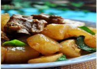 4、焖煮至萝卜透味后,试下味再酌情添加精盐,转大火收浓汁,下青蒜段(蒜叶)翻炒出香味后,起锅盛盘。