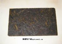 青砖茶外形长为长方砖形,色泽青褐,香气纯正,滋味尚浓无青气,水色红黄尚明,叶底暗黑粗老。每片青砖重2公斤(其中洒面、二面占0.125公斤,里茶1.75公斤)大小规格为34X17X4厘米。