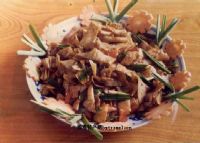 制作方法:选料半干半湿的松滋地产荞麦豆皮,放入油锅内煎炒,七成熟,放入适量食盐、味精、蒜苗、姜味、豆瓣酱爆炒,呈金黄色即可。