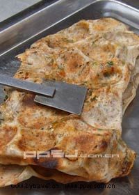 正月去归元寺玩,偶然发现附近有一卖石头饼的小摊,摊主是一对中年夫妇。男的负责揉面制饼,女的将生饼放入锅内,在饼的上下方分别铺有热气腾腾的石头。一会功夫起锅,此饼色泽金黄,外皮还有石头烙上的小炕,吃起来葱香扑鼻,别有一番滋味,一个才要一块钱。由于其做饼方法独特,一边观其手艺,一边品其大饼,食客谁也不愿马上离去。