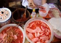 在凤凰城乡,只要有人群来往的地方,就会有卖腌酸萝卜的摊子。凤凰人不管男女老幼,都喜欢醮着鲜红的辣子汁吃腌酸萝卜片、酸萝卜梗。腌萝卜泡制的方法很多,各家自有绝招拒不外传,做得好的酸中有甜,甜中带香,再加上辣椒的辣味,尝起来独具风味。