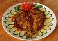 酸鱼的作法是将鲜鱼用清水洗净,剖开去其内脏、置于酸坛里、撒上一些辣椒面、盐、再与生姜、大蒜、香料拌匀,过三四天后,再将坛里的鱼取出,在酸坛底放上一层糯米饭。根据鱼的多少,一层一层装入酸坛内。摊一层鱼、撒一层糯米面或玉米面,每层都得用手压实。装完以后,再压上一层拌好的糯米饭,接着密封、盖紧。这种酸坛坛口有一个盛水凹槽,下放进适当的水,与外界空气隔绝,不使坛内的酸鱼氧化变质,这种制作酸鱼的方法,时间愈长,味道愈好。三四个月后,生吃,也能煮吃,色味形俱佳。