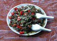 当地春夏季雨后,山头岩石壁上生长的墨绿色地菇——地衣(本地名为沙萝菇),采集后用清水反复多冲洗几次。再用坛子腌的酸辣椒和大蒜一起炒熟,出锅后洒些许香葱即成一道色、香、味俱全的地方特色美食。