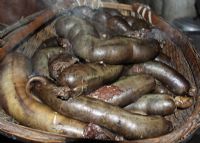 血灌粑除了要有血和肠子以外,还要加上糯米。具体的做法是,先将猪大肠洗干净备用,再把糯米洗干净,然后在糯米里加入新鲜的猪血和盐拌匀,讲究一些的还可以加入肉沫、胡椒粉、辣椒粉等,然后把混合了猪血的糯米像灌香肠一样装进猪大肠里。注意装的时候不能装的太满,要考虑到糯米煮熟会膨胀,一般只要装一半即可,再用棉线把猪大肠的两端缠紧,用针在肠子上扎一些小孔,以便透气。最后,把一节节装好了血糯米的猪大肠放在锅子里蒸熟就可以食用了。