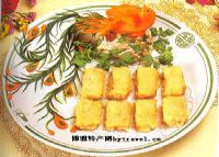 【菜名】 锅贴鱼 【所属菜系】 湘菜 【特点】 色似金黄闪光,鱼片腊香鲜嫩,临食蘸上椒盐,更显味道特佳。 【原料】 主料 青鱼肉200克,肥膘肉100克,火腿米50克,香菜末50克,鸡蛋1个,玉米粉适量。调料 植物油100克,香油25克,湿淀粉30克,料酒18克,味精2克,盐2克,椒盐少许,葱末10克,姜末10克。 【制作过程】 (1) 把青鱼肉和肥膘肉片成同样大小(鱼肉厚0.6厘米、猪肉厚0.3厘米)的4大片。 (2) 用盐、味精、香油、鸡蛋(多半)、料酒、葱末、姜末等分别煨好。(3) 用肥膘肉铺底,上面撕玉米粉,用少量鸡蛋、湿淀粉调成稀芡糊,在鱼片上挂上一层,然后放在猪肉上,中间撒上火腿米,两边撒上香菜末。(4) 炒勺内倒入植物油(50克),用文火烧热,猪肉面向下,放入勺内煎。(5) 移入旺火,倒入余量油炸至金黄色,捞出后切成小片,整齐地码在盘内即成。