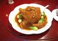 7.然后取出煨好的鸡盛入深盘,两边拼以大葱;