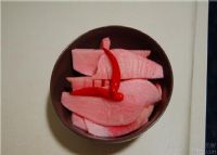 辰溪酸萝卜颜色鲜,质地脆,是湘西山区大宴上必备菜肴。由于辰溪酸萝卜香甜可口,既生津又开胃,投放市场后,大受欢迎,现已成为馈赠远方友人的特色的礼品。辰溪酸萝卜主要取材于沅水河中的两大江洲(木洲、当江洲)生产的红萝卜,把清脆可口的红萝卜采来后,放在流水中冲洗干净,切成均匀的薄的片儿,拌上作料,放在粉红色的酸水中浸泡,经一个晚上取出,拌上喷香的油发辣子,便是辰溪著名的酸萝卜。