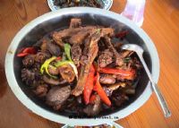 1.将熟鹅肉切成1厘米见方的小块,用花生油炸一下捞出来,待用。