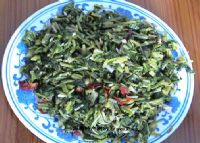 腌蕨菜半磅,洗净,用水泡去盐分,切成一寸长的段。葱丝姜丝在热油锅中爆香加蕨菜段煸炒,淋入香油出锅。