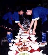 合龙饭的菜肴以酸鱼、酸肉、酸菜为主,食糯米饭,每位客人一份,并以树叶为底置于长桌的两边,每份糯米饭上放有一串新鲜肉和豆腐。客人就座以后,在开餐以前还有一段集体酒令和一个仪式。