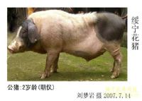 绥宁花猪为肉脂兼用型猪种,体型中等大小,体质结实,结构匀称。毛色由白色和黑色组成,因玉鼻和镶嵌在额中的白毛衬托而表现为典型的“花头猪”。根据体表白毛面积多少主要分为“大白花”和“小白花”。前者除头、耳、臀尾部为黑色外,嘴筒、额中、肩部、四肢腹部、尾尖均为白色,包括“花头白身”和“花头黑臀”。后者不同的是,黑色从臀尾部延伸至腰荐部或胸背部,呈典型的“花头盖雪”状。“马鞍花”在猪的背腰中部有一片马鞍状黒毛,“斑点花”在猪的背腰或臀部分布有形状、面积不一的黒色斑块。毛色的变化可在同窝猪中体现出来,如朝仪乡铁坡村一窝12头20日龄仔猪,花头白身3头,花头黑臀3头,花头盖雪6头,其中腰背部散在1~2个黑斑者5头,比例对应为1﹕2﹕2。从原产区野外个体调查中拍下48头绥宁花猪照片,其中肥猪5头,种猪43头。“大白花”和“小白花”各占50%,在“大白花”猪中,“花头黑臀”占58%,“花头白身”占42%。绥宁花猪头型主要有三种:长嘴花,头较小清秀,嘴筒、鼻梁长而直,额较窄,皱纹少;短嘴花,嘴吻和身躯较短;大头花,头大额寛有较深的横行皱纹,体躯比较高大。绥宁花猪耳较大肥厚下垂,头颈结构匀称,背腰平直或稍凹,腹中等大不拖地,臀部倾斜欠丰满,0长而较小,排列匀称,奶头多为12~~17个,四肢较粗壮。绥宁花猪初生时为立系,大约一岁后部分立系慢慢的变为卧系。这与小栏圈养,填草积肥,不设运动场,长期生活在松软潮湿狭窄环境中缺乏运动以及缺钙等因素有关。尾大较短,一般不超过飞节,肋骨13~14对,成年公猪都长有獠牙。