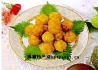 2、勺内放猪清油,油烧至四成热时,把虾泥挤成丸子,用小勺舀着下入勺内,炸呈浅黄色,捞出装盘即成。吃时蘸花椒盐。注:做这个菜必须使用清油,作出来才能保证色泽美观。色泽越浅越好。