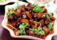 【菜名】 酸辣狗肉 【所属菜系】 湘菜 【特点】 此菜香味浓郁,肉质鲜嫩软烂,芡汁稠浓,辣中带酸。 【原料】 鲜狗肉1500克,香菜200克,泡菜100克,干红椒5只,冬笋50克,绍酒50克,小红辣椒15克,精盐5克,青蒜50克,酱油25克,味精1.5克,醋15 克,胡椒粉1克,湿淀粉25克,桂皮10克,芝麻油15克,葱15克,熟猪油100克,姜15克 【制作过程】 1、 将狗肉去骨,用温水浸泡并刮洗干净,下入冷水锅内煮过捞出,用清水洗2遍,放入砂锅内,加入拍破的葱、姜、桂皮、干红椒、绍酒25克和清水,煮至五成烂时,切成5厘米长、2厘米宽的条。将泡菜、冬笋、小红辣椒切末,青蒜切花,香菜洗净。 2、 炒锅置旺火上,放入熟油50克,烧至八成热时入狗肉爆出香味,烹绍酒,加入酱油、精盐和原汤,烧开后倒在砂锅内,用小火煨至酥烂,收干汁,盛入盘内。 3、 炒锅内放入熟猪油,烧至八成热,下入冬笋、泡菜和红辣椒煸几下,倒入狗肉原汤烧开,放入味精、青蒜,用温淀粉调衡勾芡,淋入芝麻油和醋,浇盖在狗肉上,周围拼上香菜即成。注意:1、 选用膘肥体壮、健康无病的狗为上。 2、 狗肉有干腥味,刚宰杀时用温水洗去腥味。 3、 煨制时用小火,中途不可加汤,时间2小时左右。 4、 酸泡菜制洗:将水坛洗净抹干,放入温开水2500克,再加精盐150克、花椒25克、八角5克、白酒100克、白糖50克、黄醋50克,然后将需要浸泡的蔬菜洗净晾干,盛入坛内密封浸泡一二天,即成泡菜。