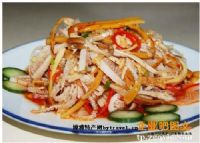 【菜名】 好丝百叶 【所属菜系】 湘菜 【特点】 鱼肉肥嫩鱼肉肥嫩细腻,蘸以姜末、香醋,口味鲜美 【原料】 生牛百叶750克,湿淀粉15克,水发玉兰片50克,味精1克,干红椒末1.5克,精盐3克牛清汤50克,芝麻渍2.5克,葱段10克,熟茶油100克,黄醋20克 【制作过程】 1、 将生牛百叶分割成5块,放入桶内,倒入沸水浸没,用木棍不停地搅动3分钟,捞出放在案板上,用力搓去上面的黑膜,以清水漂洗干净,下冷水锅煮1小时,至七成烂捞出。 2、 将牛百叶逐块平铺在钻板上,剔去外壁,切成约5厘米长的细丝盛入碗中,用黄醋10克、精盐1克拌匀,用力抓揉去掉腥味,然后用冷水漂洗干净,挤干水分。 3、 玉兰片切成略短于0僖兜南杆俊4星谐?厘米长的段取小碗1只,加牛清汤、味精、芝麻油、黄醋10克、葱段和温淀粉兑成芡。 4、 炒锅置旺火,放入茶油,烧至八成熟,先把玉兰片丝和干椒末下锅炒几下,随下牛百叶丝、精盐2克炒香,倒入调好的汁,快炒几下,出锅即成。