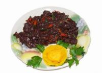 武冈“血浆鸭”,营养丰富,香甜俱全,吃起来香甜、酸辣、嫩脆、鲜美、佐料易找,炒法简单。 炒制“血浆鸭”的方法是:选用一公斤左右重量的本地仔鸭,备好子姜二三两、大蒜一两,鲜红辣椒三至四两(青椒亦可),米醋一两(醋精配清水或用酸水亦可),甜浆一两等作配料。