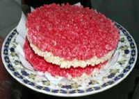 是用糯米饭制成的,其制作方法是将糯米淘洗数次,放置清水中浸泡发胀后,分成两半,其中一半拌上食品红,一并置于甑内(中间用隔板间开)蒸熟。然后取出摊在一个碗口大小的篾箍内,使之粘合平整均匀。每个米花约1cm厚,由红、白两层组成,上层为红米饭。将做好的米花摆在篾垫或木板上,放在阳光下晒干。白色底层若碎玉铺就,红色面层如玛瑙嵌成,远远看去,像艳丽的花朵,故称之为“米花”。