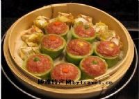 4、熟猪油烧至六成热,放蒜瓣炸一下捞出,苦瓜入锅,待苦瓜表面炸至淡黄色捞出,竖放碗内,撤上蒜瓣,加酱油入笼蒸熟;