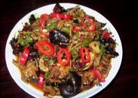 鸡腿切块、飞水,水里放几片姜,大概半斤小青椒切碎,木耳撕成小片,五片姜切成丝,三瓣蒜切片,一个红辣椒切圈(为了好看,没有可以不用)。