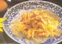(2)姜丝、干椒末、花椒末用油煸香后再加肉清汤,焖的时间不能长。