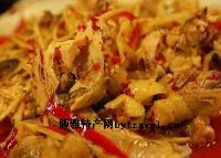 3、 炒锅内倒油烧热,下入花椒、干红辣椒、生姜丝煸炒,下入鸡肉,倒入料酒、煮鸡肉的汤,用精盐、白糖、味精、鸡粉、醋调味,翻炒至鸡肉条熟后,放入面,勾芡收汁,淋香油即成。