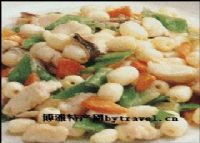 ③炒勺上火,入油放鸡丁煸炒,八成熟后,入胡萝卜丁,四季豆小段及莲子,翻炒均匀至鸡丁成熟。