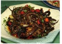 盘龙黄鳝这道菜味道麻辣鲜香、刀工讲究,而且吃法也相当另类,吃的时候,你要夹住鳝头,咬住鳝背,用力一扯,鳝头带骨全部脱落,留在嘴里的便是嫩滑可口的鳝肉了。