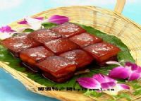 (5)食用时,将热的酥方皮先划成4块,再切解成4厘米长、3厘米宽的长方小块,放在原方肉上装盘,随着荷叶夹或双麻饼、甜酱、大葱、葱花、鸡汤一并上席。