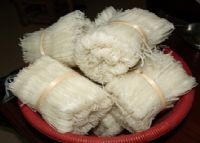 3)晒。把粉皮放到竹编的竹寮上凉晒至半干,然后折叠成四至五等份,再用两块竹寮夹好凉晒至七成干,趁着粉皮未干,把折叠的粉皮用大闸刀按一定规格切成一圈圈的粉丝,再次用两块竹寮夹好,放在太阳下晒干,把干透的粉丝用竹蔑缠绑成梱。