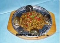 3、净锅置旺火上,放入植物油,下姜末、蒜末、干椒段及上述配料,煸炒至香,然后放入腌好的南美螺,加精盐、味精、蚝油、蒸鱼豉油、十三香、孜然粉和紫苏叶,烹入料酒,翻炒断生,淋香油,勾芡,盛入烧热的铁板中,撒葱花即成。