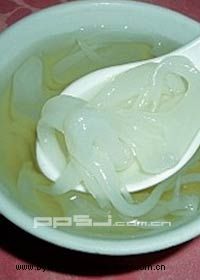 沙溪冰凌角仔在其他地方已经甚为少见了,在沙溪只有两间食店还会有这种食品的烹制方法,冰菱角仔大概在民国初年就在沙溪出现了。“冰菱角仔”是因为当它煮熟,过冷河之后就像是剥掉壳的菱角,两头尖中间鼓;又加上颜色剔透妨如冰花,故名之,吃在嘴里富有弹性,且多食不腻。
