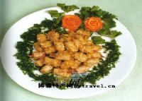 (3)烧热炒鼎倒入生油,待油烧至七成熟时,将鱼册拖上蛋粉浆投入油鼎拉一下油倒出,沥去油分。炒鼎下猪油,把蒜米炒成金黄色,倒入鱼册,烹入料酒,和小碗内的调料,颠翻几下,取出装盘即成。