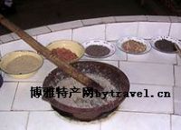 葱、韭菜、大蒜、萝卜干等炒熟配料。配料可按各自口味选择,少则三、五种,多则二十余种。还有一种是用擂茶泡“甫米”,叫“甫米茶”。正月初七,习惯用七种蔬菜泡擂茶,叫“七样菜茶”;元宵那天,习惯用十五样蔬菜泡擂茶,叫“十五样菜茶”。擂茶芳香可口,风味独特,能增进食欲,提神醒脑,可作正餐,也可作点心敬客。