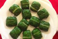 酿菜包是纯手工制作而成的,采用农家金叶菜,馅是用农家韭菜、薯粉、土猪肉混合一起做成的。先把整片的金叶菜用开水煮一下,然后把做好的馅包在用开水烫过的金叶菜里,最后把菜包摆放在锅里加水慢慢熏熟。
